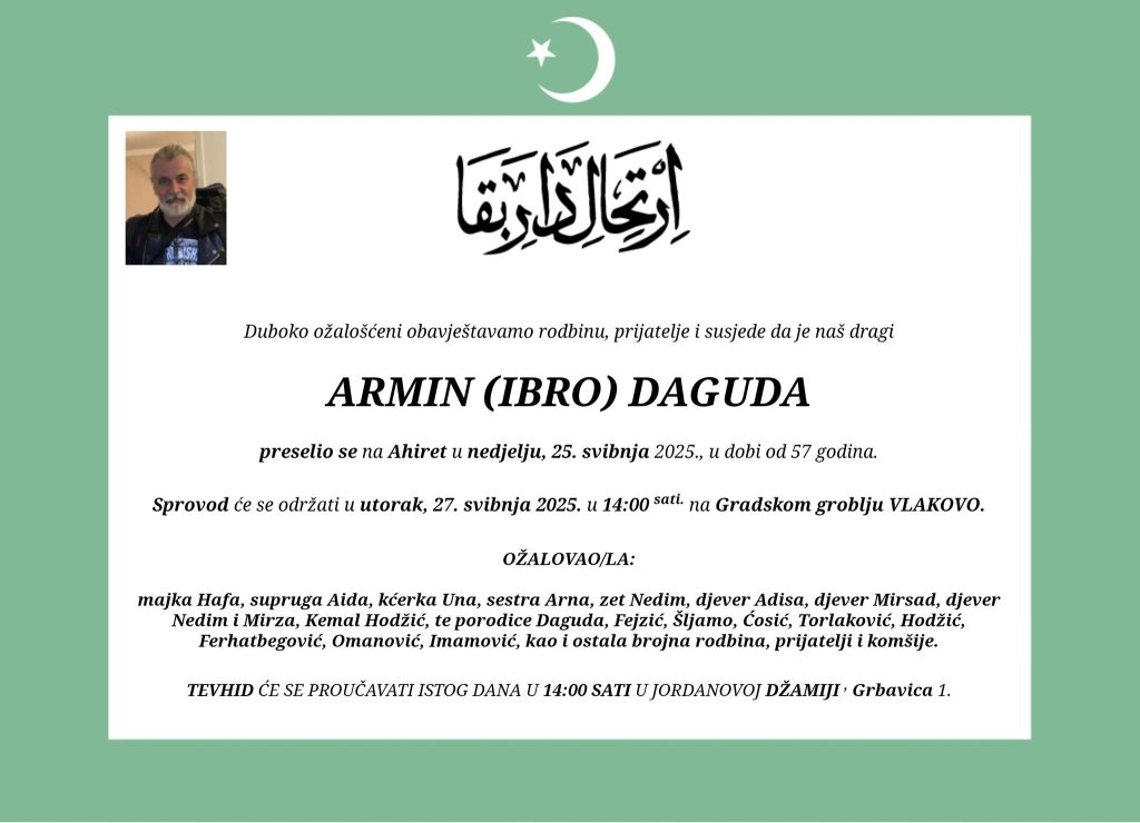 Obavještavamo prijatelje i planinare da nas je napustio naš dragi prof. Armin Daguda, čovjek velikog srca koji je ostavio neizbrisiv tag u planinarstvu Bosne i Hercegovine, ali i u srcima svih nas.